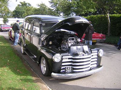 The Goodwood motor circuit ran a series of breakfast meets during 2006 (1st Sunday of each month), with the last one of the year having an 'Americana' theme which was right up our street. Appropriate cars get preferred parking near the café & track, and it seems anyone driving something interesting gets into the paddocks which makes for plenty of shiny motors to walk round. Earlier events were apparently rammed full but the wet weather for this one may have put some people off - nevertheless there were plenty of cars and a relaxed atmosphere all morning. After driving through torrential rain and wind to get there, Goodwood itself stayed dry and the sun even broke though to shine off the chrome and flake. You could get a full brekkie for top dollar at the café but the rodders choice was tea & bacon roll at the upmarket Goodwood burger van, nice grub. Lord March obviously takes an active interest in the events and was strolling around all morning looking at the cars. Big thanks for opening up your 'garden' for us - let's hope it becomes a regular event. Oddly, there were rubber marks in the road outside the circuit afterwards....