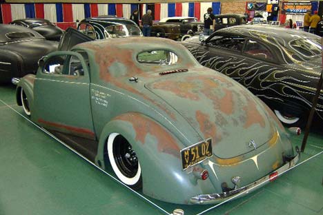 Yeah, I know, all this beautiful machinery and here I am getting all excited about a couple of painted feet. But hey, I’m a striper and it’s Dutch’s work! From the museum, it was into the show itself and if I had been impressed so far (and I had), then I wasn’t prepared for what was to come. For those of you who have never been, the GNRS is held at the Fairplex in Pomona and it’s ‘kin huge! The car show fills 6 or 7 buildings, each of which would comfortably hold at least 2 football pitches. Herb took me straight to the suede room as this was where we were to be striping the next day. In here were all the so called ‘Rat Rods’ and some very nice drag cars. To be honest, calling some of these cars Rats is an insult. Although they are in suede paint, they are still beautifully finished. Take this one for example. It may look unfinished but those of you who know your coupes will instantly be able to tell that this car is glass as they were never offered as a 3 window! I had a sneaky feel of the fender and I can tell you that the fake rust even felt real, the texture was just right as well as the appearance. Here are a few more from the suede room. From there it was into the next room where we met Von Hot Rod, the striper who had organised the reunion. I didn’t get to see too much more of the show that day as we spent a couple of hours chatting to folk and supping beers. It was very cool though to find that there are folk in LA who keep a regular watch on my website and admire my striping as much as I admire theirs. So after a dinner in the hotel on the Fairplex and a few more beers, it was back to Thumper’s and off to bed. In all honesty, at this point, if I had been put back on the plane and sent home the trip would have been worthwhile! Little did I know what was to come.